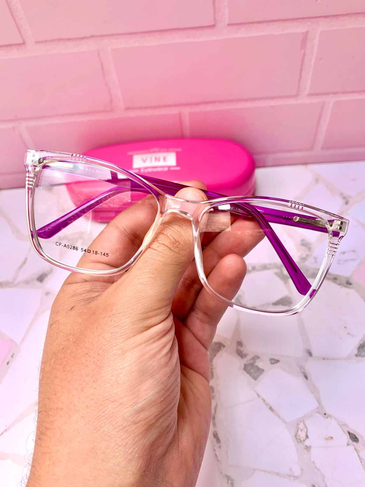 Nossa armação em acetato feminina Helga é o modelo perfeito para as amantes de óculos transparentes. As hastes roxas criam um contraste que deixa a armação ainda mais marcante e viva.