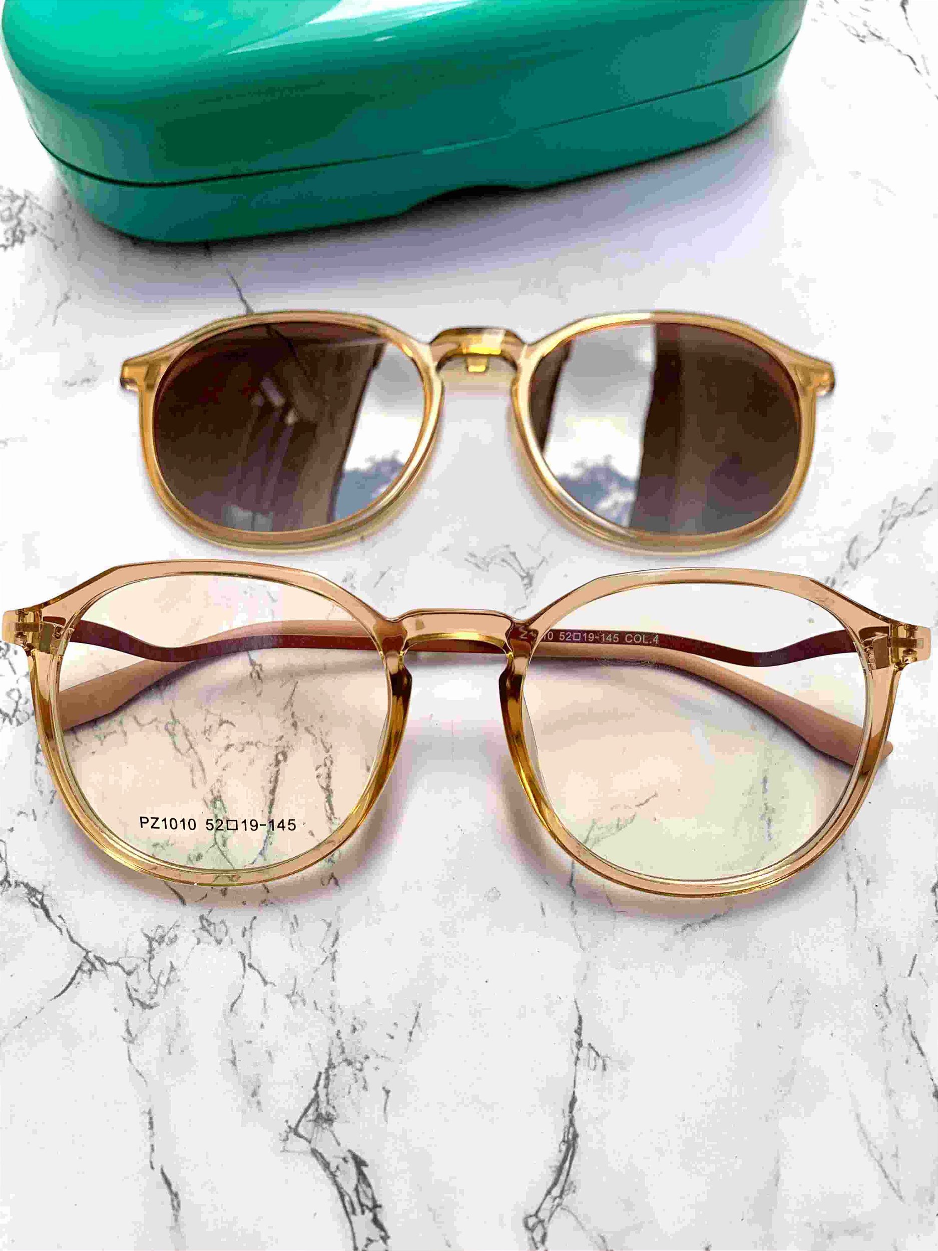 Nossa armação clipon PZ1010 é o modelo de óculos ideal para você que gosta de óculos modernos com cores leves. O tom de cor âmbar é sutil e diferente. A lente solar clip-on transforma a armação em um belo óculos de sol com grau