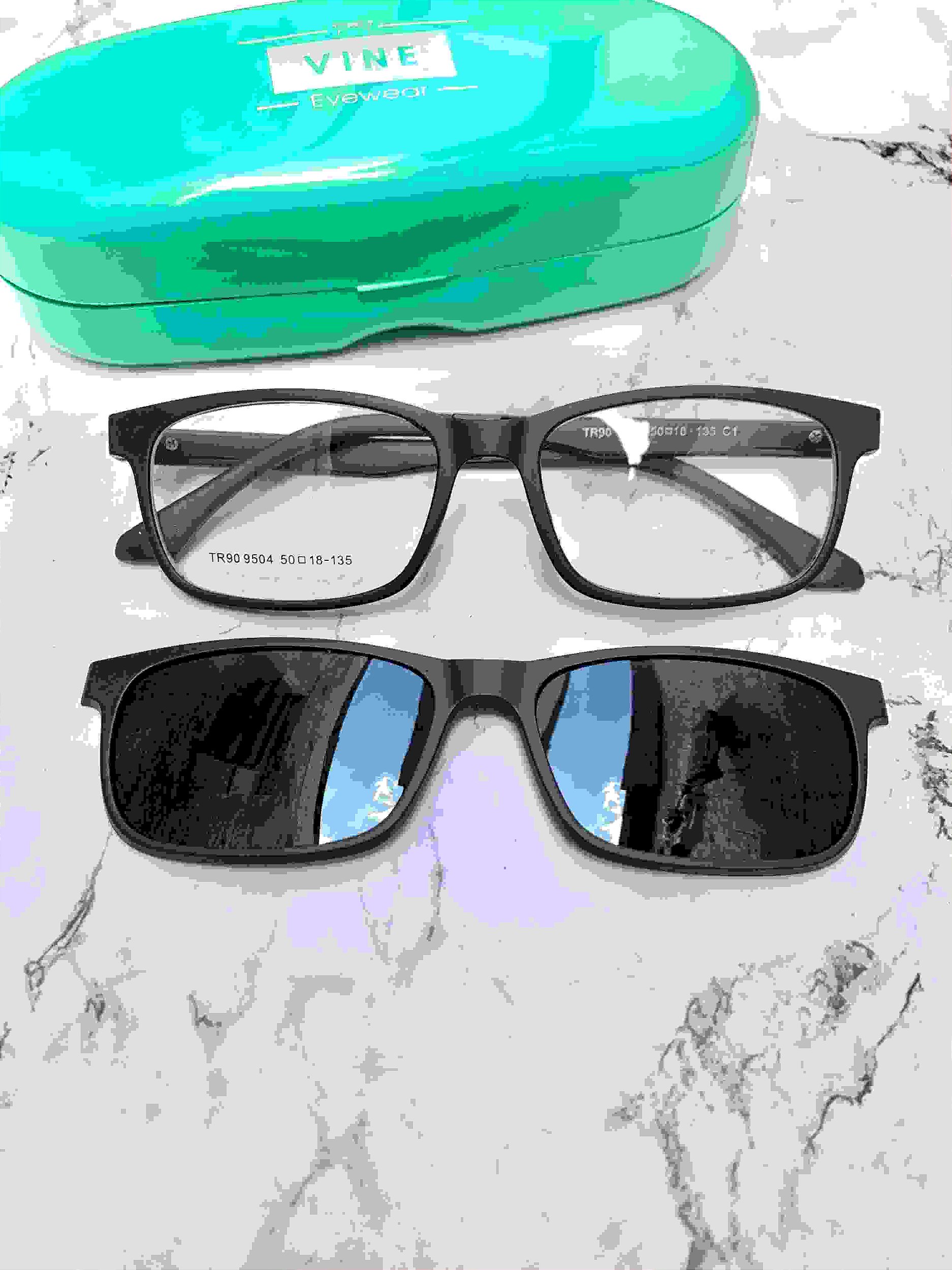 Armação leve, pequena e com lente solar clip-on adicional, que a transforma em um verdadeiro óculos de sol com grau